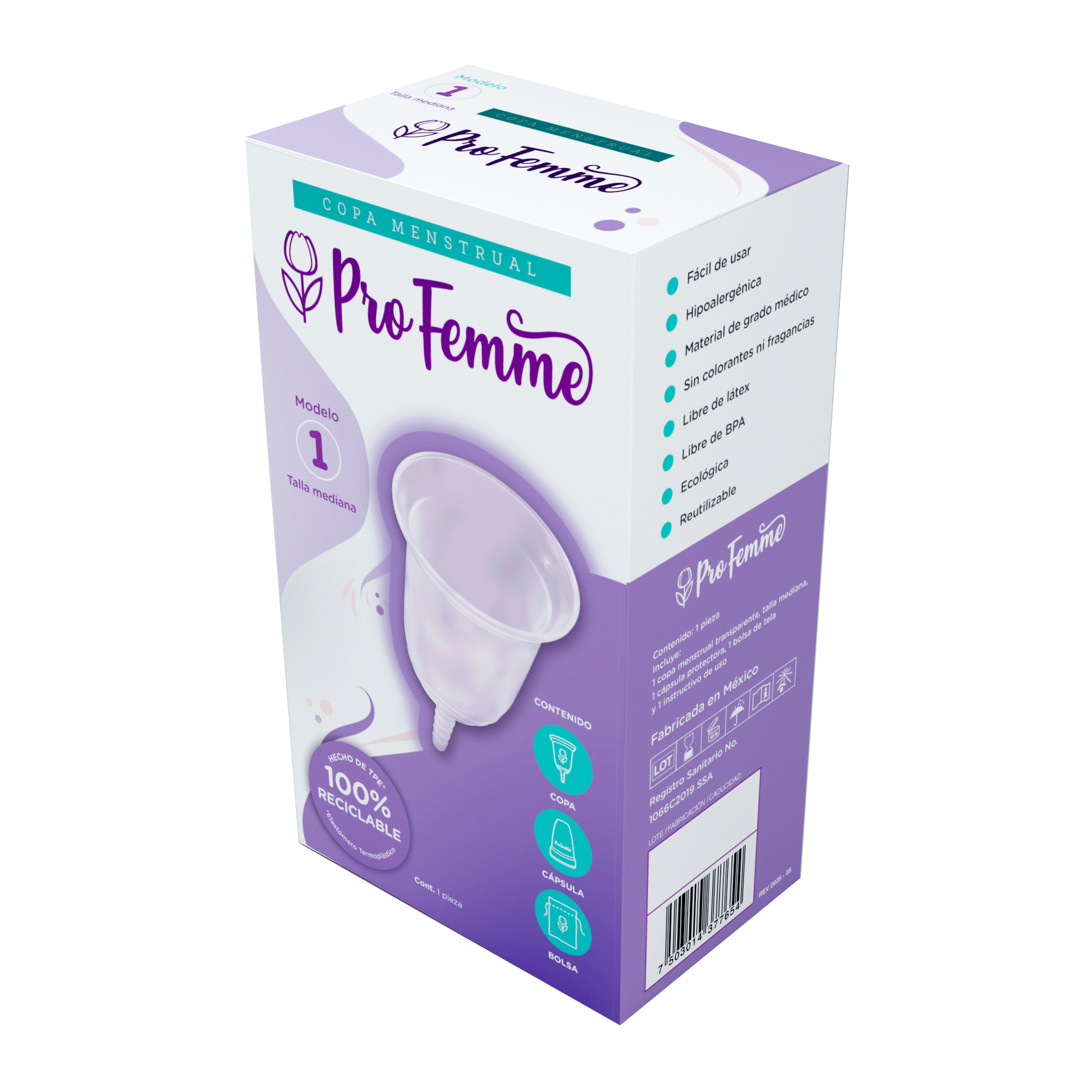 Somos la primera copa menstrual hecha en México que cuenta con registro sanitario de Cofepris. ProFemme está hecha con TPE (elastómero termoplástico), un material de grado médico certificado e hipoalergénico, que además es 100% reciclable a diferencia del silicón o látex usado en muchas copas.